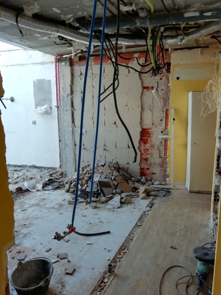 Para finalizar, hablamos un poco de la iluminación. En este caso se ha decidido colocar todo el sistema de focos empotrados en techo con un diseño muy estético y limpio. Y utilizamos tira de led indirecta para zona de muebles de cocina.